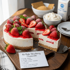 Enjoy crafting your easy, creamy no-bake strawberry cheesecake-a luscious delight that’s as simple as it is stunning!