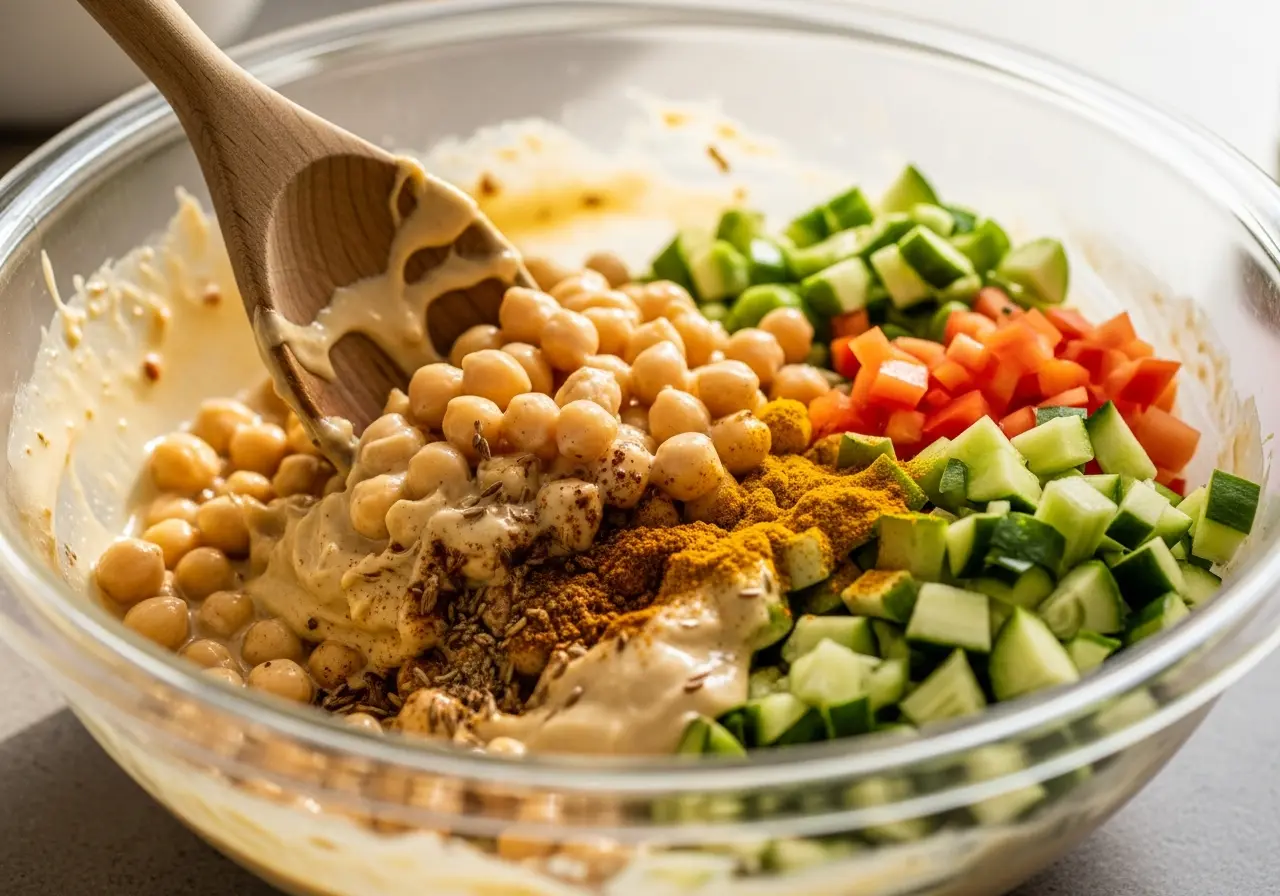 - Mix fresh with Creamy: Add the fresh vegetable mixture to the chickpeas and dressing. Toss gently but thoroughly to combine all elements harmoniously.