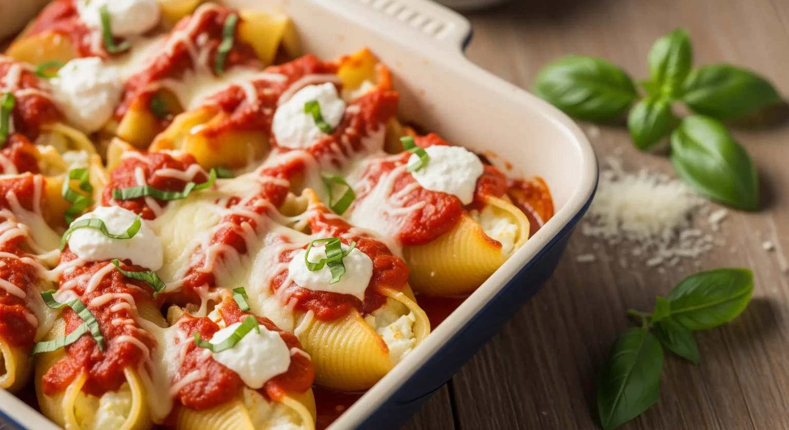 Savory stuffed shells baked to golden perfection with cheese and marinara sauce
